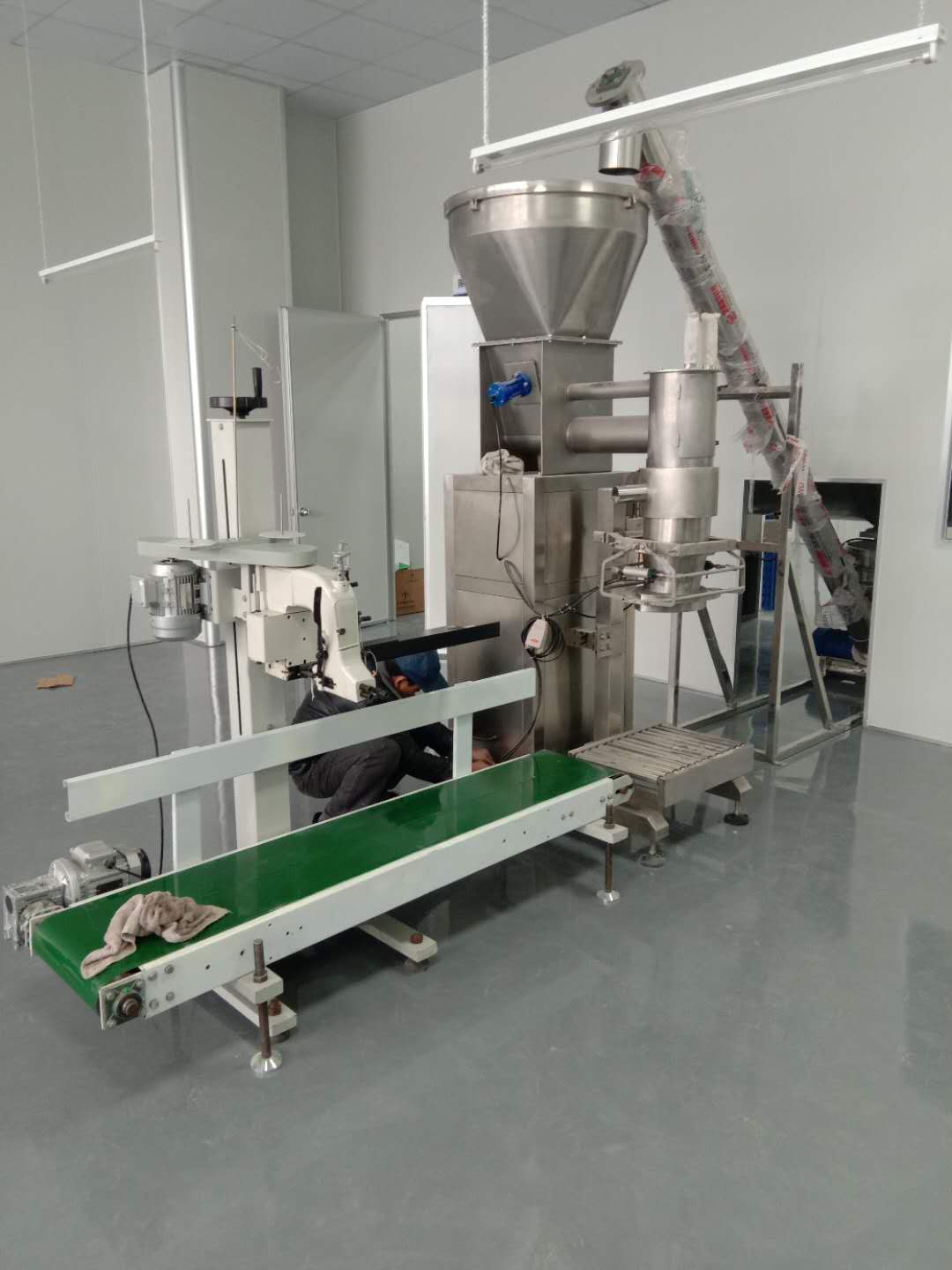 上海鑄衡工廠生產的這臺螺旋定量包裝秤是針對粉狀流動性較差的物料設計而成的包裝秤,采用落地型架構,結構體積小,安裝方便。包裝秤具有稱量精度高,操作簡單方便、可靠性強、功能完備等特點。基本配置:儲料斗(帶電子式料位器)、單螺旋給料裝置、落料斗及夾袋機構、稱重主架、稱重儀表控制箱、皮帶輸送機、縫包機及縫包立柱